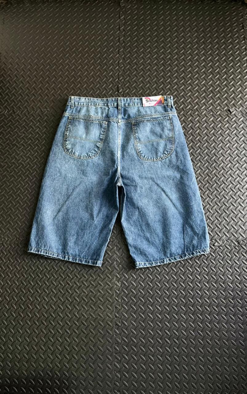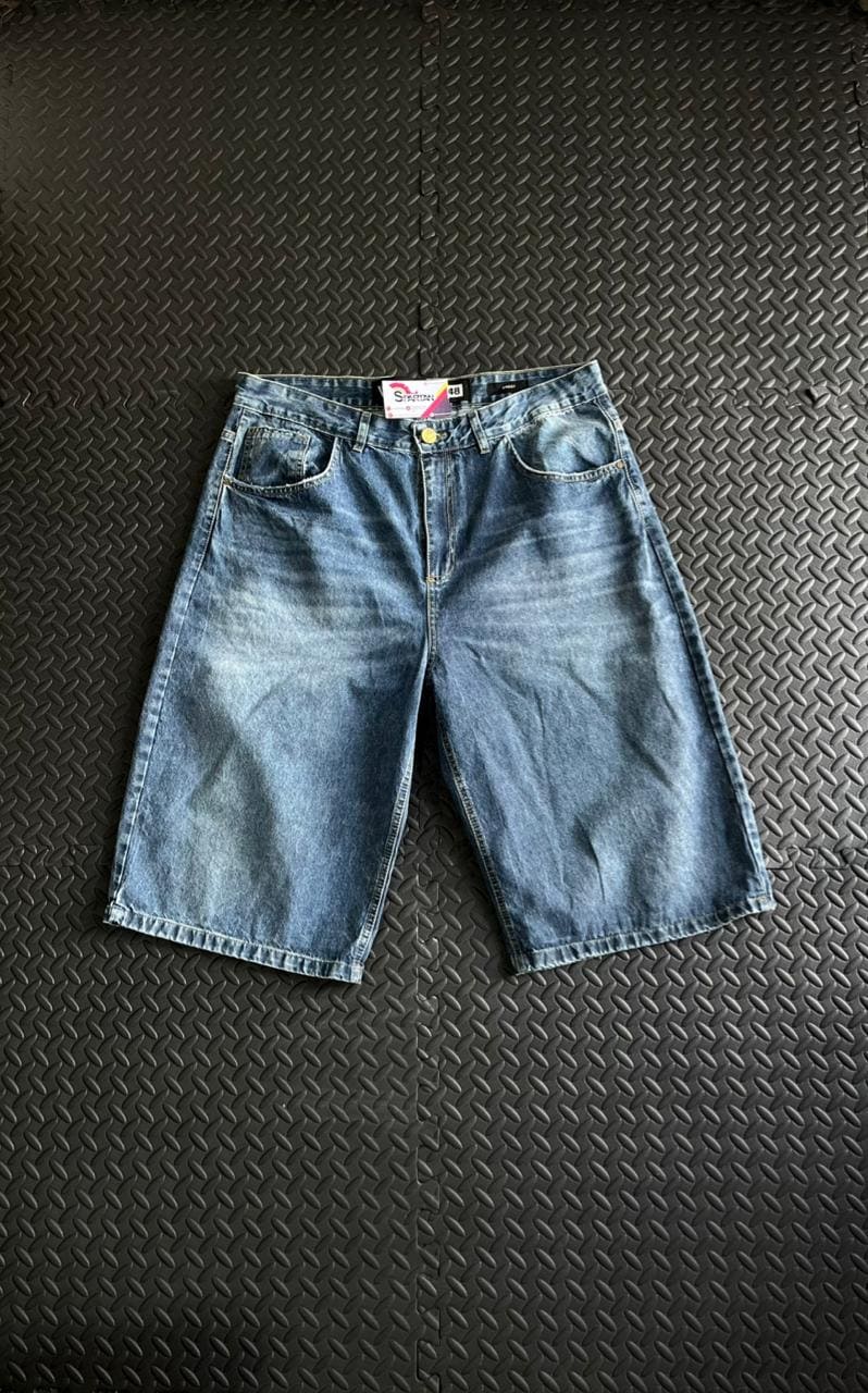 Bermuda Baggy Denim Bermuda de jean baggy fit, con lavado azul gastado y terminaciones desflecadas en el ruedo. Su diseño liso y relajado la convierte en un básico del estilo urbano, ideal para outfits streetwear cómodos y con actitud.